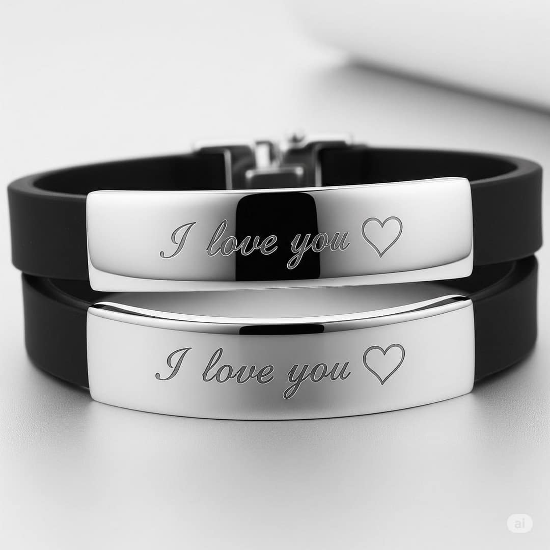 Лазерная гравировка на парных браслетах: имена, даты и надписи для двоих.