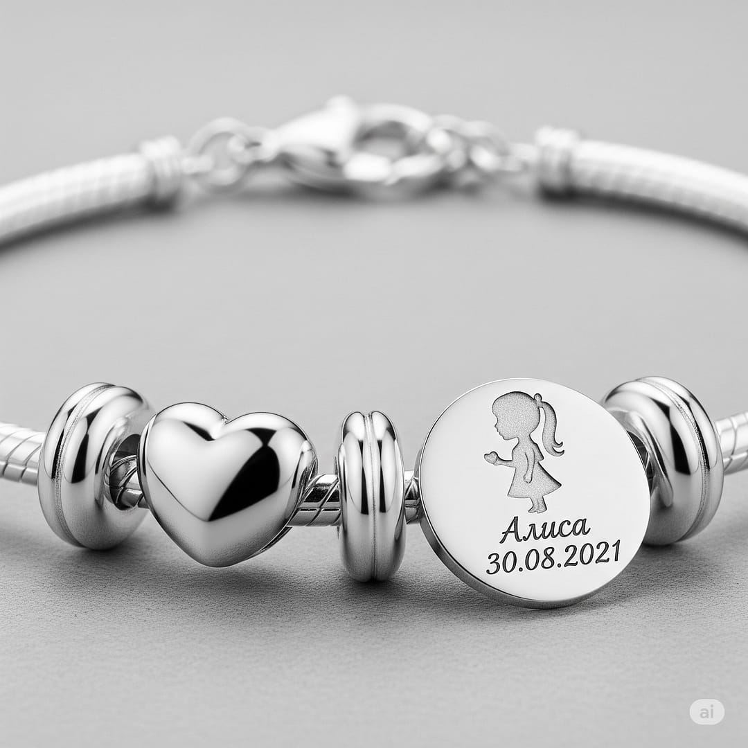 Лазерная гравировка на шармах для мам: имя и метрика ребенка.