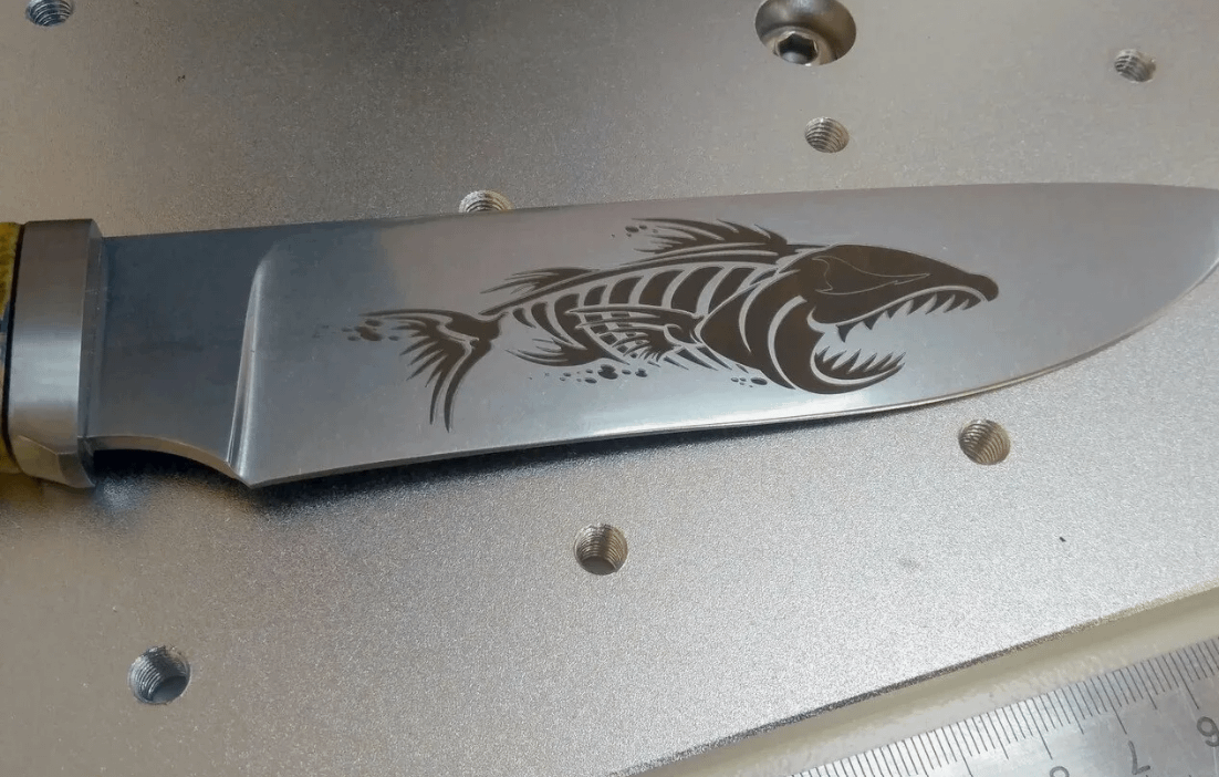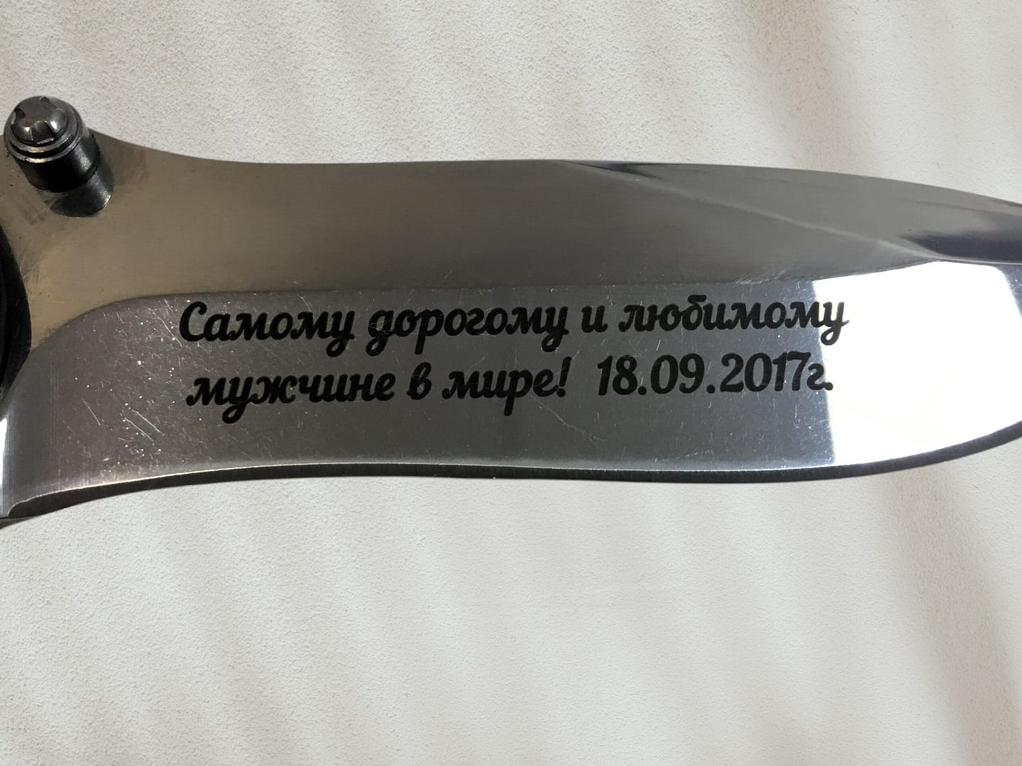 Лазерная гравировка памятной надписи, даты или инициалов на лезвии ножа.
