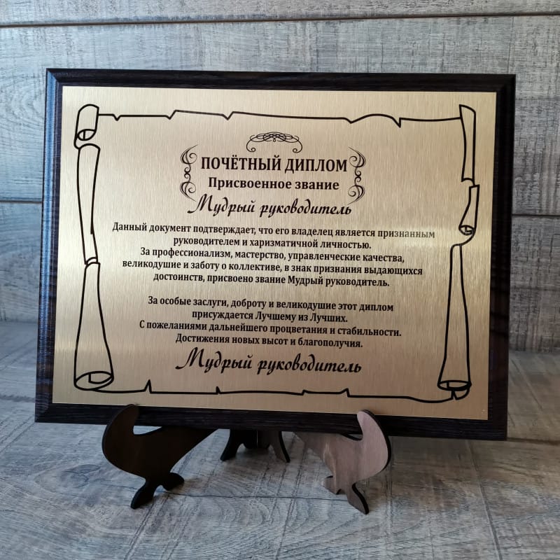 Диплом из металла на деревянной подложке с лазерной гравировкой
