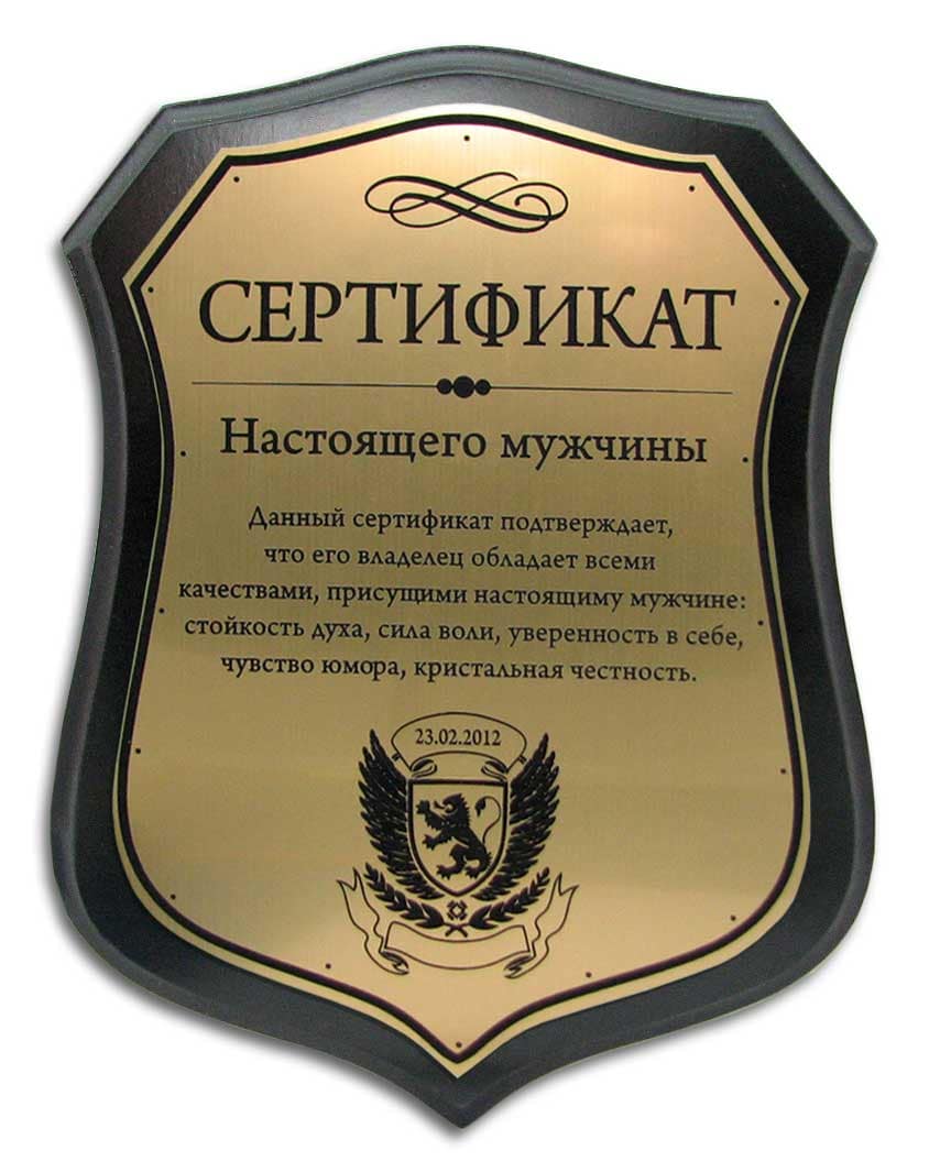 Сертификат с гравировкой на металлической пластине с золотистым покрытием